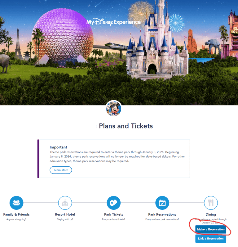 Here is how you can get your Advanced Dining Reservations. Go to your My Disney Experience using your browser on your PC. Hover over the My Disney Experience on the top right of the screen and select “My Plans”.